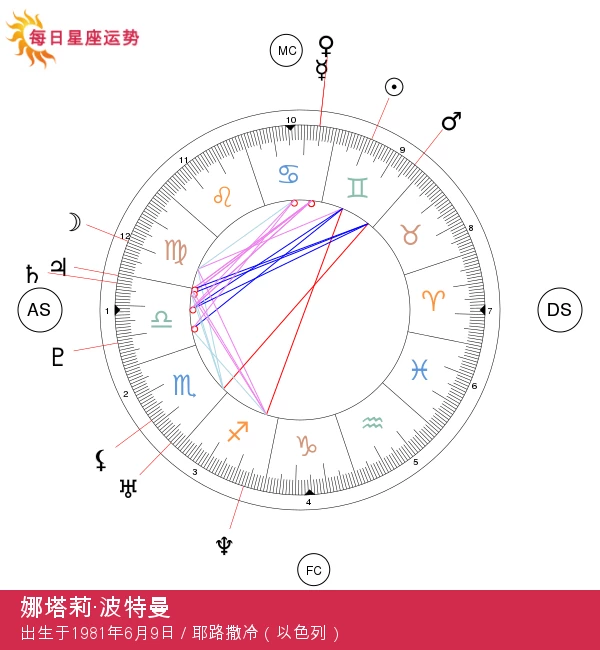 娜塔莉·波特曼的星座图中有空气元素,象征着智力、沟通和艺术表现力。她对周围环境具有出色的适应能力和强烈的社交能力,对人类表现出真诚的兴趣。她的成长源于与他人的联系,在智力能力和沟通渴望方面脱颖而出。然而,她有不稳定和优柔寡断的特征,有时会显得散漫或过于分析。